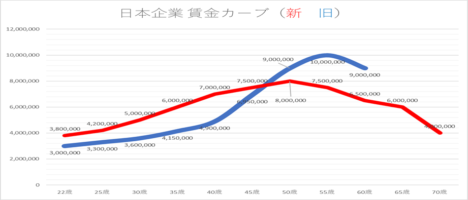 社員のこれまでの生涯賃金カーブを下のグラフのように見直す必要があります。子供の教育費等の支出が増えるミドルからカーブが上昇し、55歳前後をピークに定年まで平行またはなだらかに下降する今までの従来の賃金カーブをミドル前半で頭打ち、ミドル後半から下降するカーブへとの見直しが必要となります。